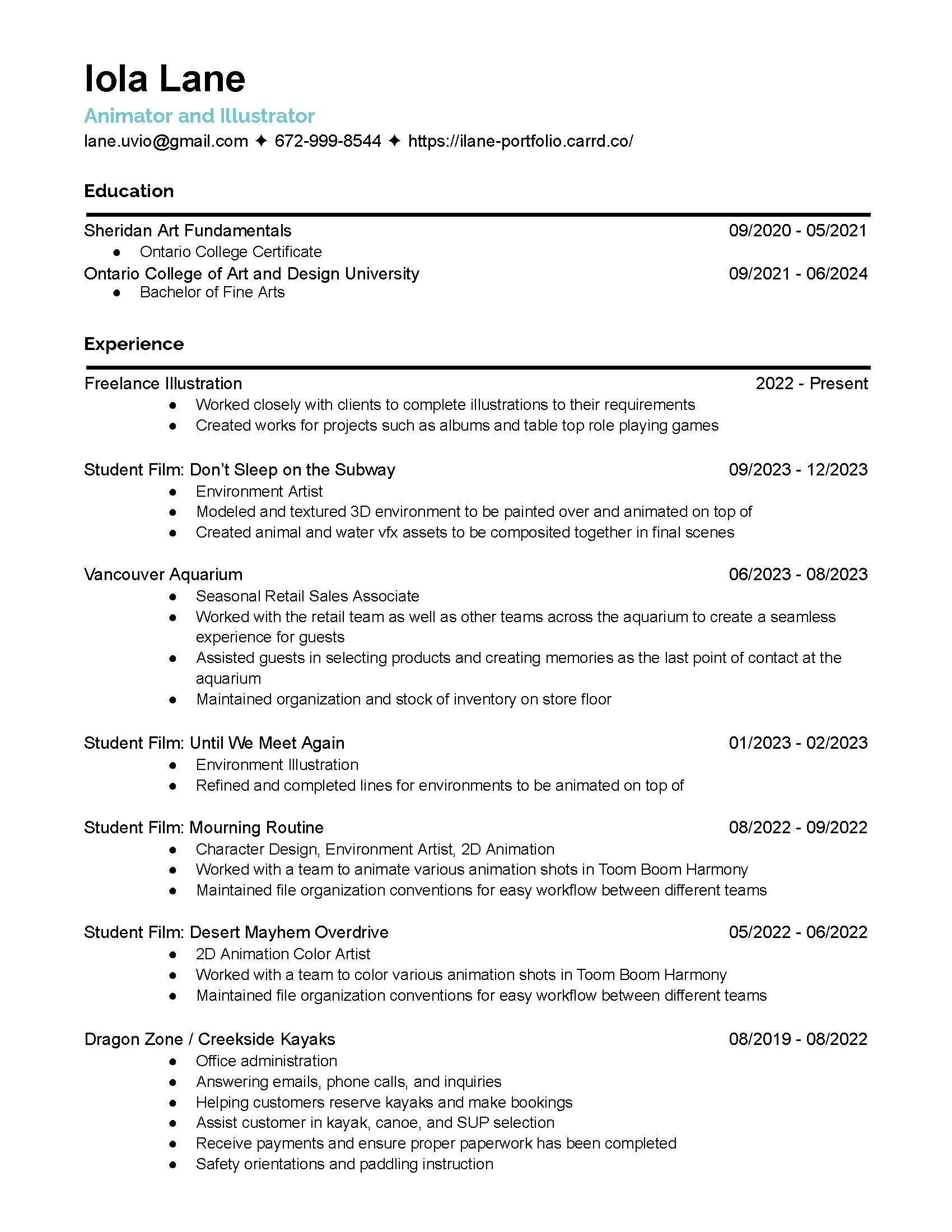 Iola Lane is a Toronto based artist currently in their 4th year of Experimental Animation at OCADU.Their previous role experience includes Environment Design, Character Development, Animator, and Color Artist.When they're not in school, they split their time between Vancouver, BC, and Irvine, CA, drawing and playing video games!EMAIL : [email protected]